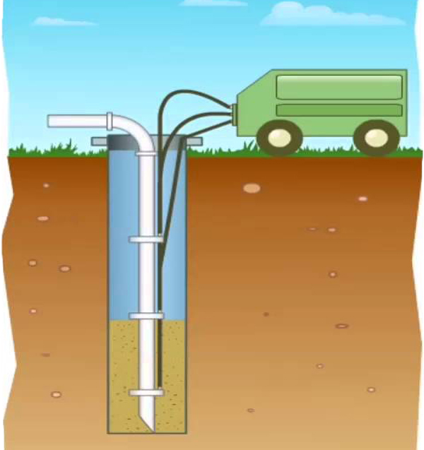- Под действием сжатого воздуха, отложения и загрязнения, которые накопились в скважине, отрываются от стенок оборудования и смещаются к поверхности.