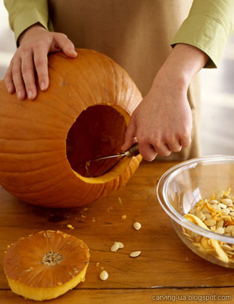 - Очищайте внутренности: С помощью ложки или другого острого инструмента, удалите семена и мякоть тыквы изнутри. Будьте осторожны, чтобы не повредить стенки тыквы.