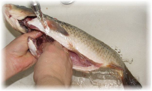 - Помойте карпа в воде, удалив остатки кишечника и другие отходы.